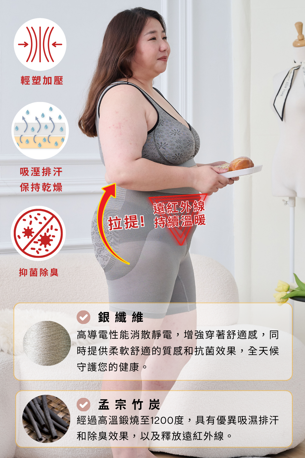 【孟宗竹炭纖維】經過高溫鍛燒至1200度,具有優異吸濕排汗和除臭效果,以及釋放遠紅外線。竹炭纖維柔軟親膚,透氣性佳,保持皮膚乾爽舒適。
